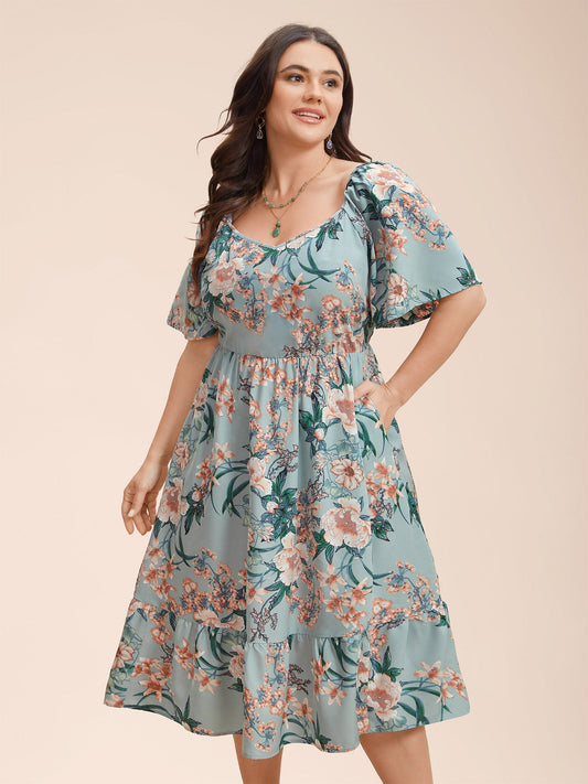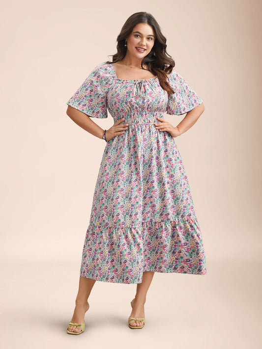 Square Neck Floral Print Tassels Tiered Midi Dress