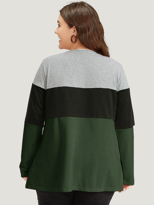 Colorblock Contrast Crew Neck Ruffle Layered Hem Blouse