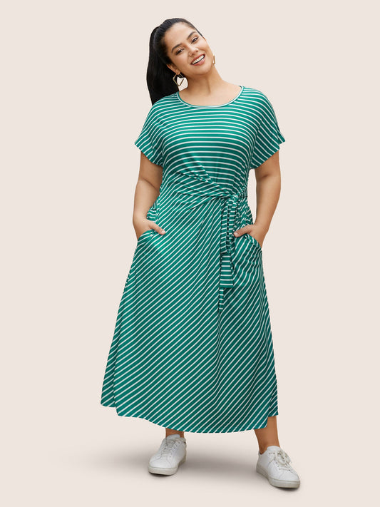 Striped Tie Knot Batwing Sleeve Split Side Dress