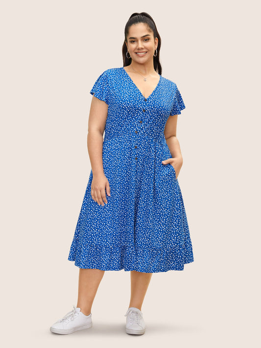 Ditsy Floral Button Detail Flutter Sleeve Dress
