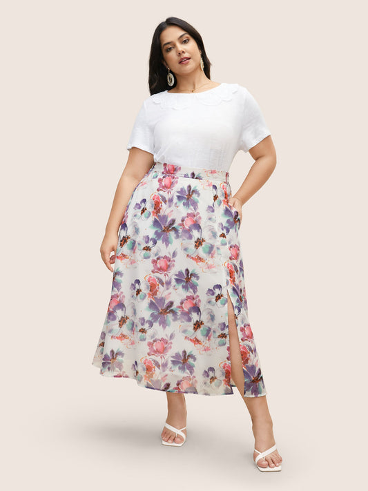 Watercolor Floral Print Slit Hem Pocket Skirt