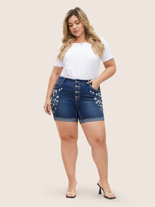 Floral Embroidered Dark Wash Roll Hem Denim Shorts