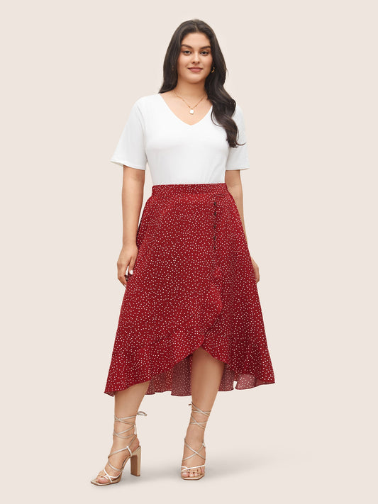 Polka Dot Button Detail Ruffles Arc Hem Skirt