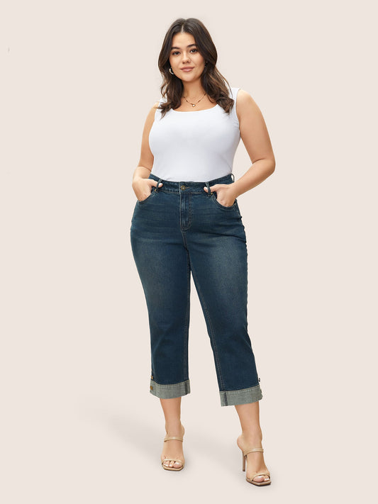 Straight Leg Patchwork Hem Metal Button Detail Jeans