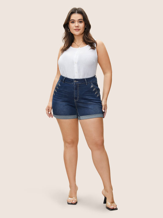 Dark Wash Button Detail Roll Hem Denim Shorts