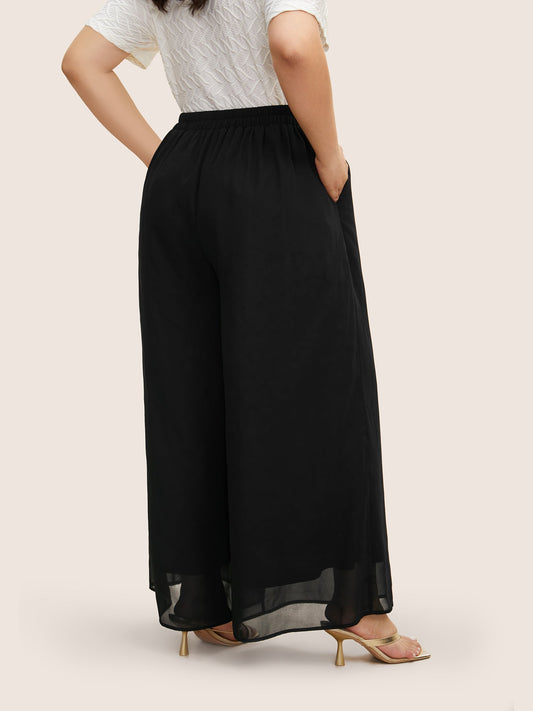 Mid Rise Mesh Elastic Waist Wide Leg Pants