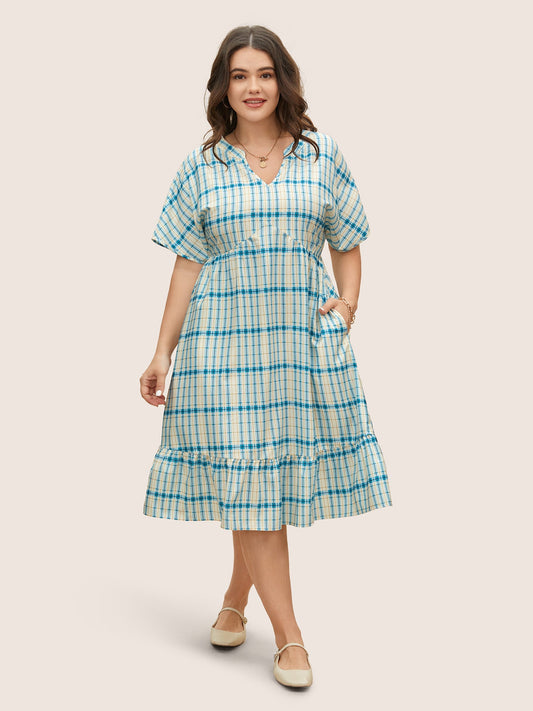 Notched Collar Plaid Dolman Sleeve Pocket Dress