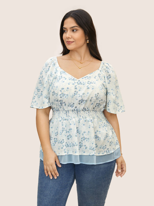 Natural Flowers Shirred Patchwork Ruffle Sleeve Blouse