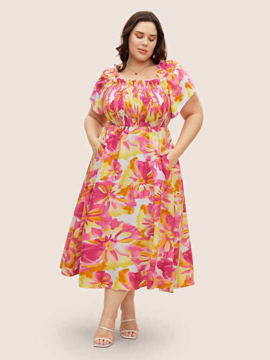 Floral Square Neck Shirred Frill Trim Midi Dress