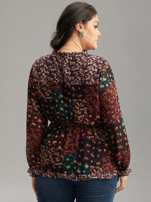 Ditsy Floral Shirred Patchwork Frill Trim Gathered Blouse