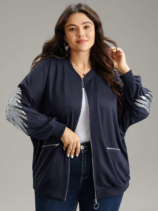 Solid O Ring Zipper Pocket Feather Bomber Jacket