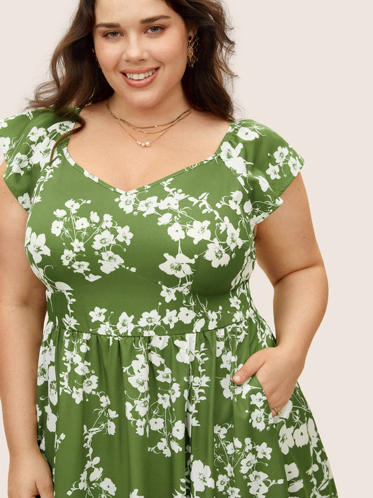 Floral Square Neck Shirred Ruffle Sleeve Dress