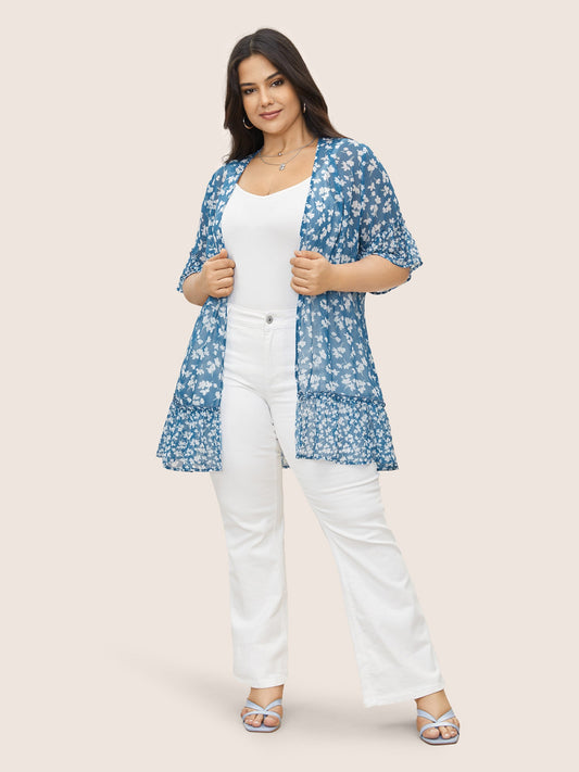 Floral Overlap Collar Gathered Ruffle Sleeve Dress