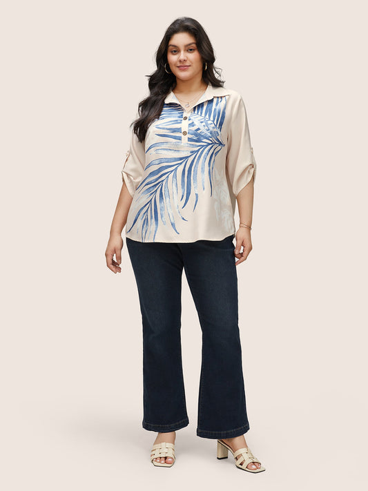 Tropical Print Button Up Tab Sleeve Blouse
