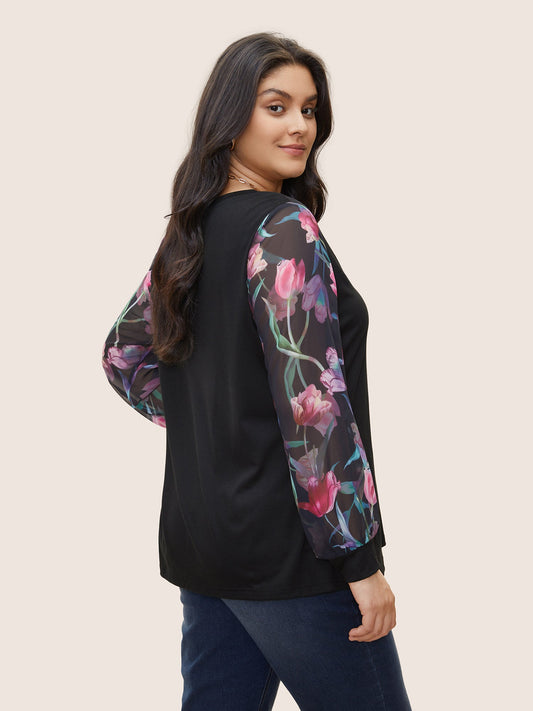 Floral Patchwork Mesh V Neck T-shirt