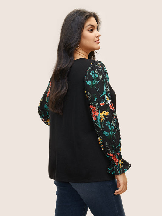 Floral Patchwork Shirred Round Neck T-shirt