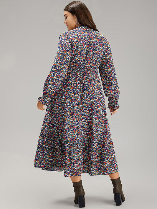 Ditsy Floral Shirred Frill Trim Ties Dress