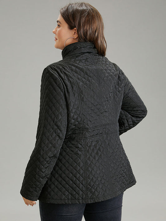 Plaid Patchwork Drawstring Zipper Fly Flap Pocket Coat