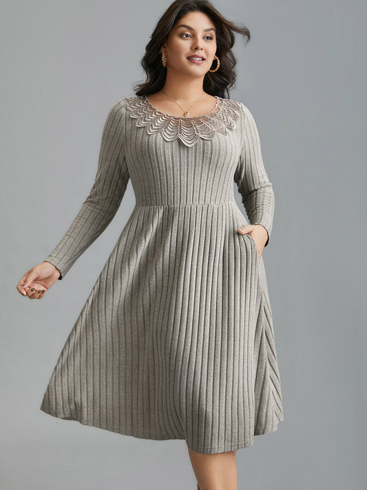 Lace Neck Patchwork Ribbed Knit Dress