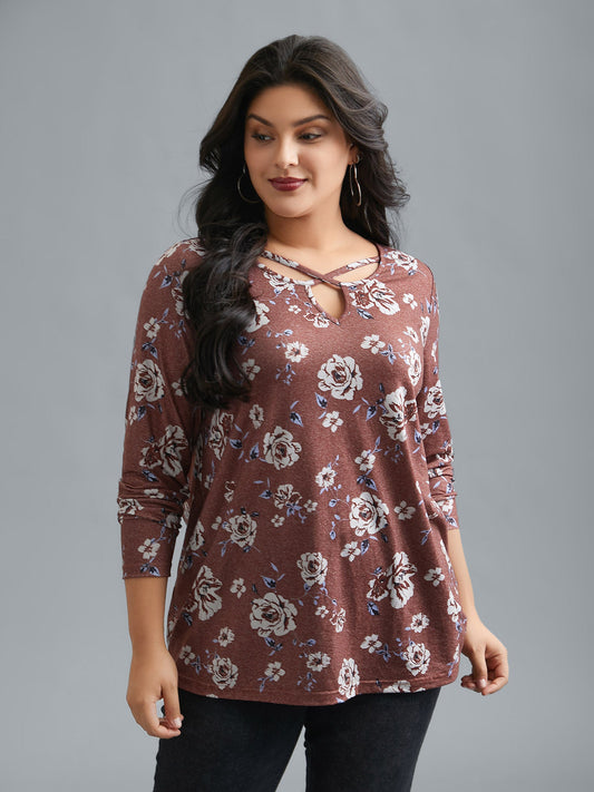Notched Collar Floral Crisscross T-Shirt