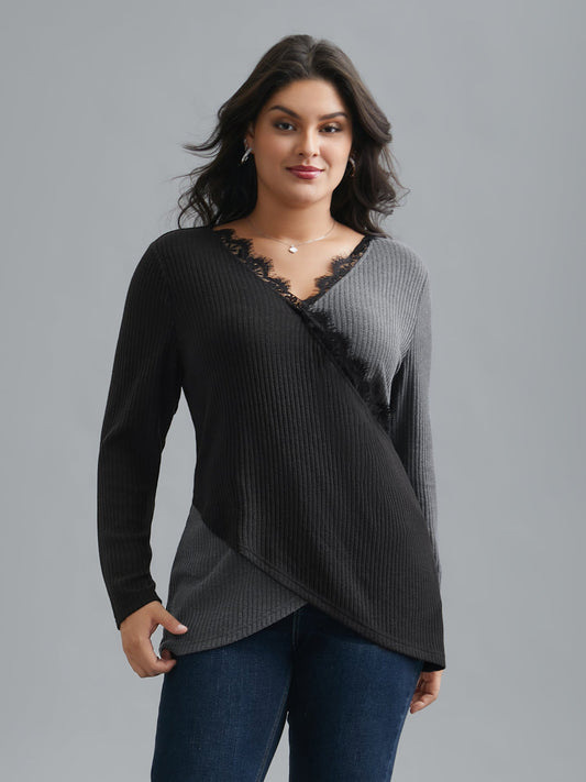 Overlap Collar Lace Trim Stitch T-Shirt