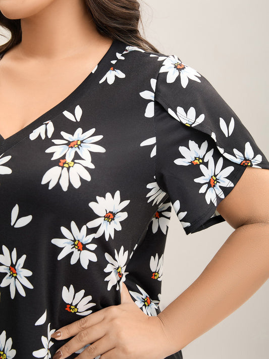 Floral Print Petal Sleeve Plain Knit Top