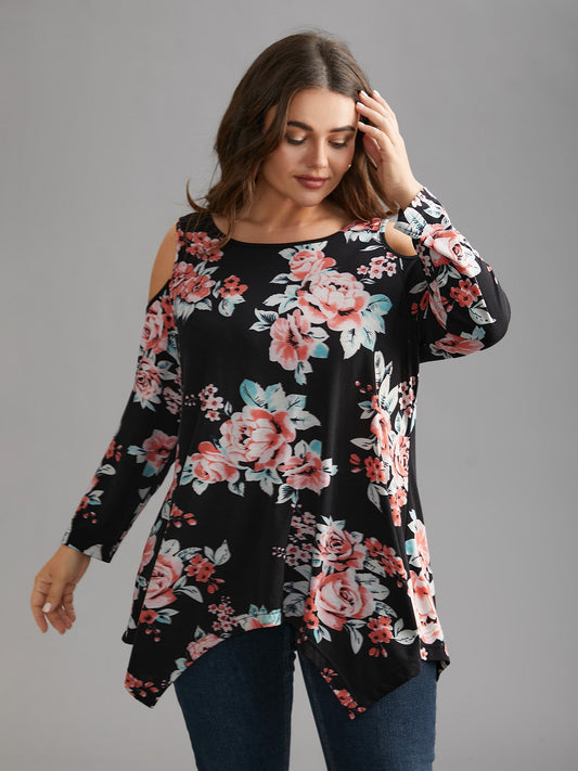 Floral Print Shoulder Cut-Out T-shirt
