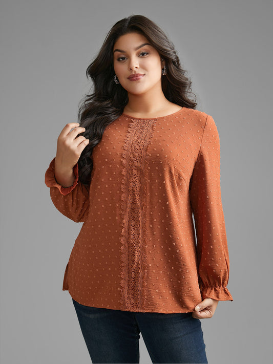 Textured Lace Panel Lantern Sleeve Blouse
