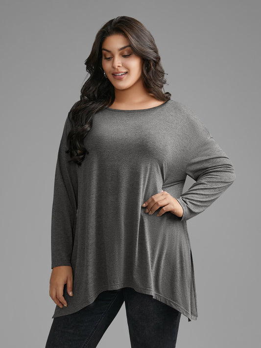 Plain Boat Neck Asymmetrical Hem T-shirt