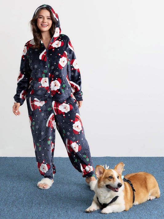 Fleece Holiday Pattern Pockets Hooded Sleep Jumpsuit