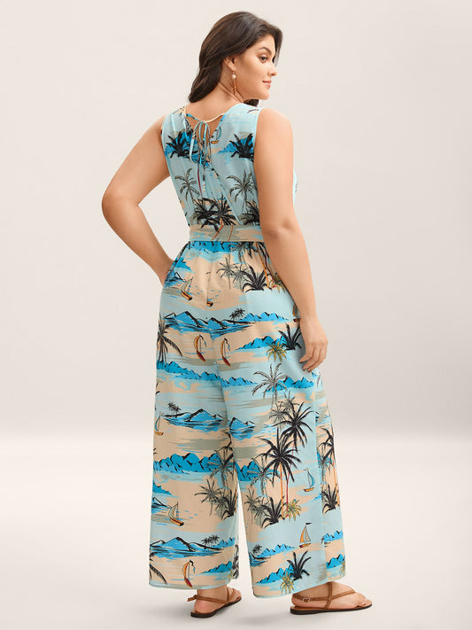Tropical Print Stretchy Waist Pockets Jumpsuit