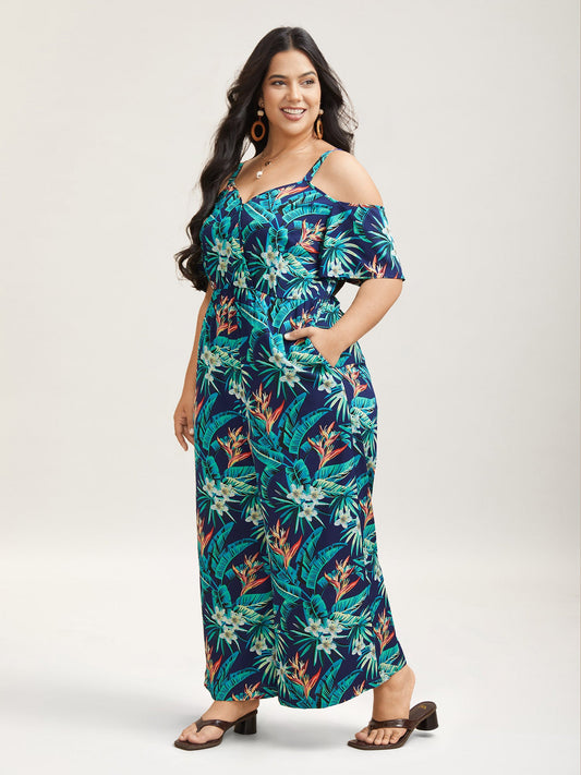 Tropical Print Cold-Shoulder Belted Jumpsuit