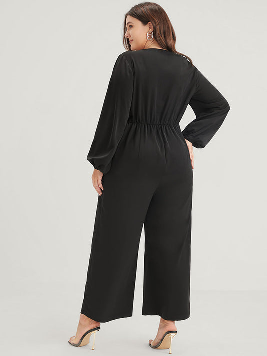 Solid Pocket Lantern Sleeve Keyhole Metal Neck Jumpsuit