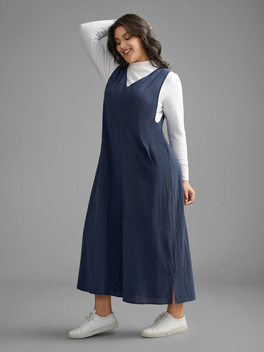 Cotton Solid V Neck Loose Jumpsuit