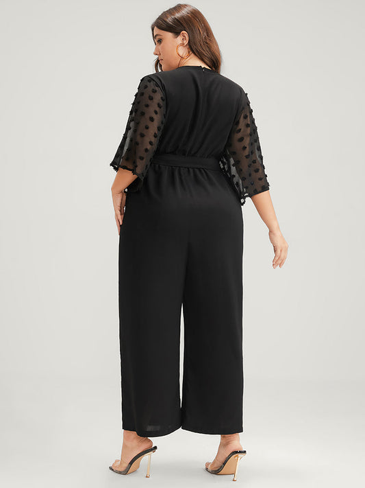 Solid Polka Dot Sleeve Mesh Pocket Belted Jumpsuit