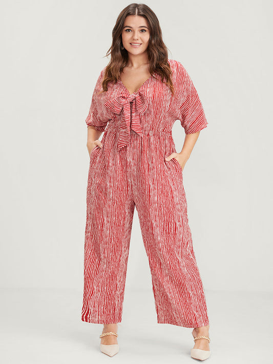 Water Ripple Pocket Elastic Waist Knotted Neck Jumpsuit