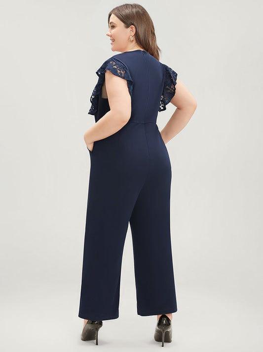 Solid V Neck Pocket Lace Trim Jumpsuit