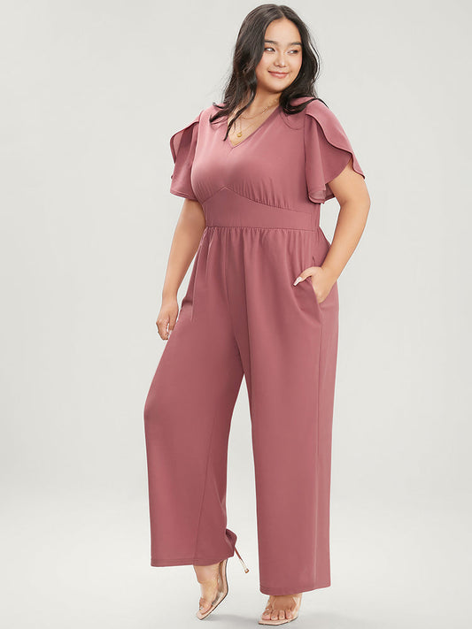 Solid Zipper Back Split Pocket Petal Sleeve Jumpsuit