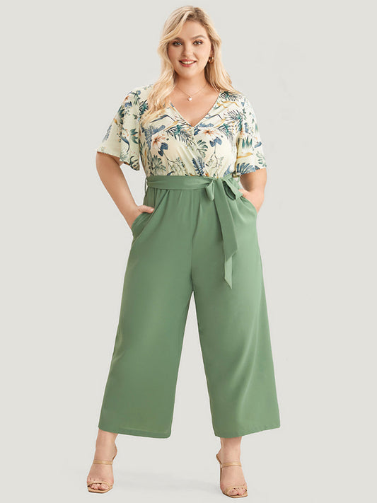 Floral Patchwork Wrap Belted Pocket Jumpsuit
