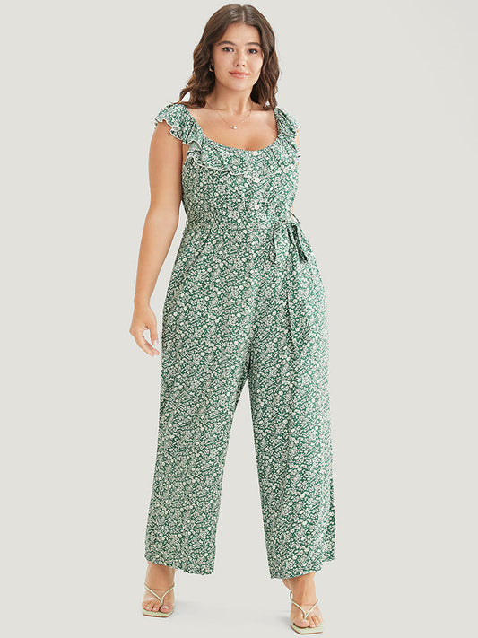 Ditsy Floral Button Detail Belt Ruffle Trim Jumpsuit