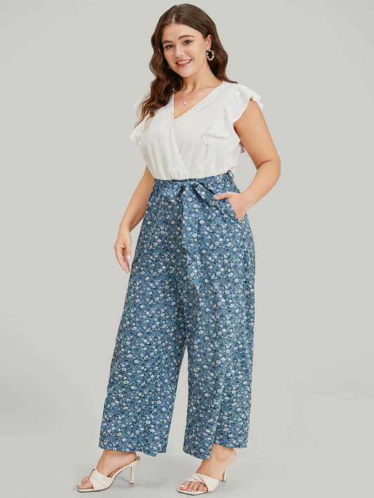 Ditsy Floral Patchwork Wrap Belted Pocket Ruffle Trim Jumpsuit