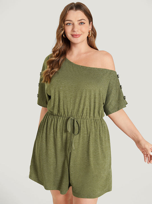 Solid Button Detail Pocket Knot Front One Shoulder Romper