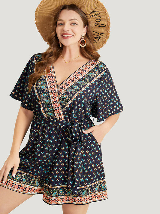 Bandana Print Wrap Ruffle Sleeve Pocket Belted Romper