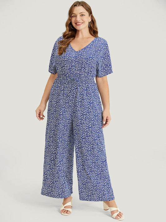 Ditsy Floral Batwing Sleeve Pocket Shirred Knot Front Jumpsuit