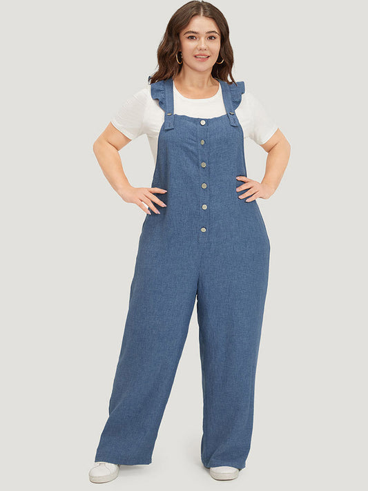 Plain Pocket Button Through Ruffle Trim Overall Jumpsuit