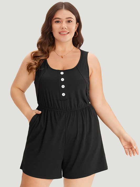 Plain Pocket Elastic Waist Button Detail Ruched Romper