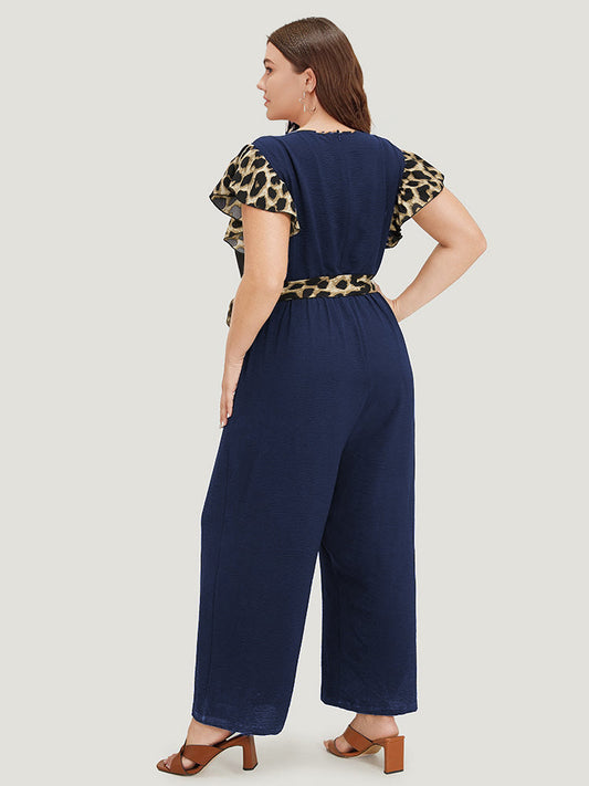 Leopard Patchwork Pocket Belted Ruffle Sleeve Jumpsuit