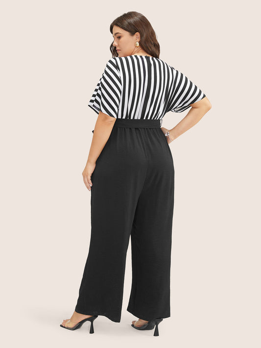 Striped Patchwork Pocket Batwing Sleeve Belted Wrap Jumpsuit