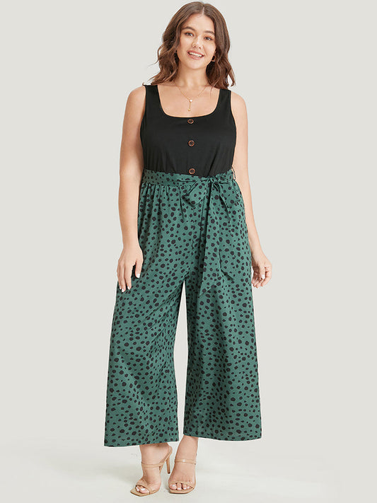 Polka Dot Patchwork Button Detail Belted Square Neck Jumpsuit