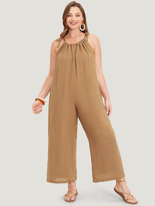 Plain Textured Pocket Halter Tie Overall Jumpsuit